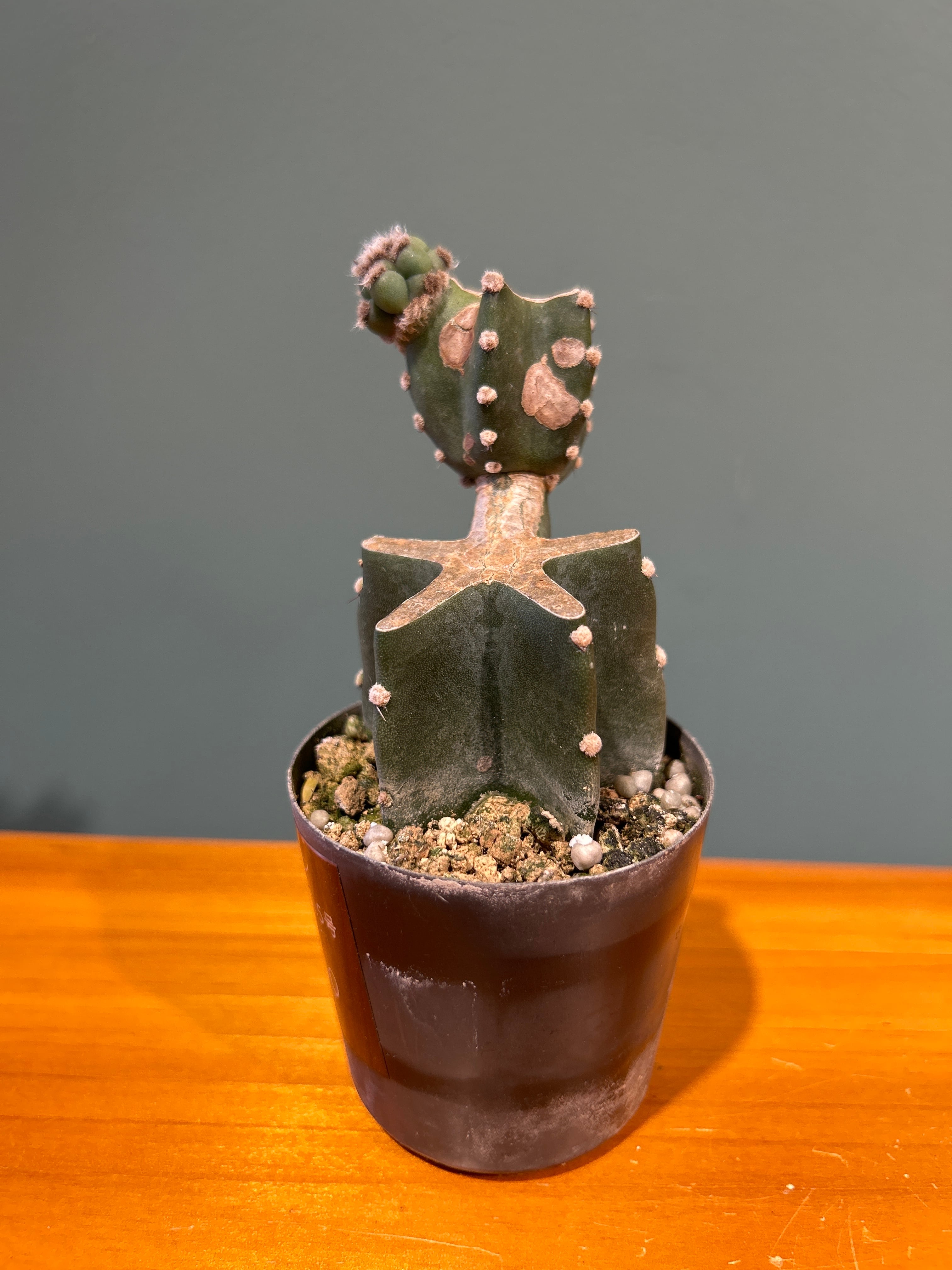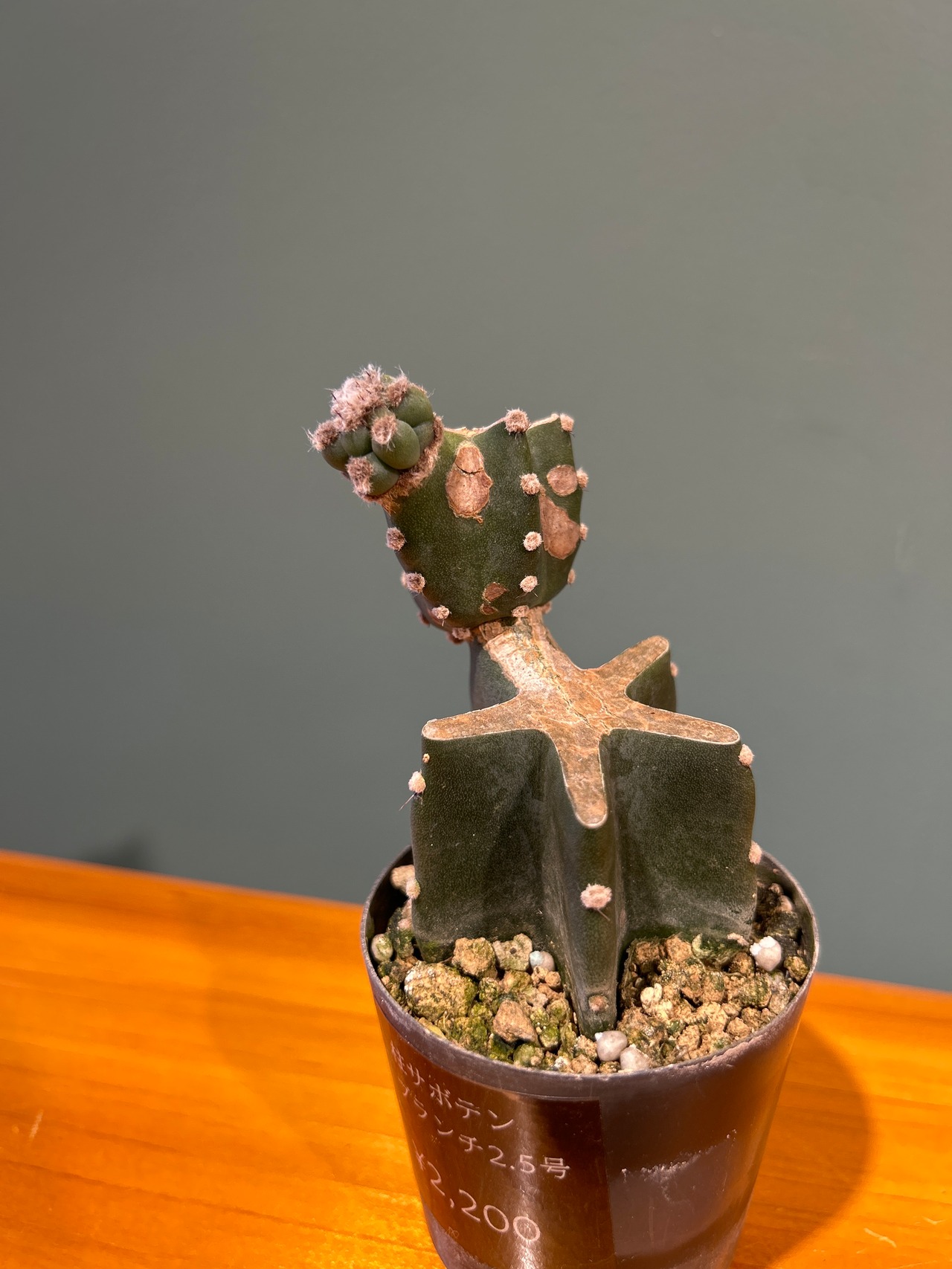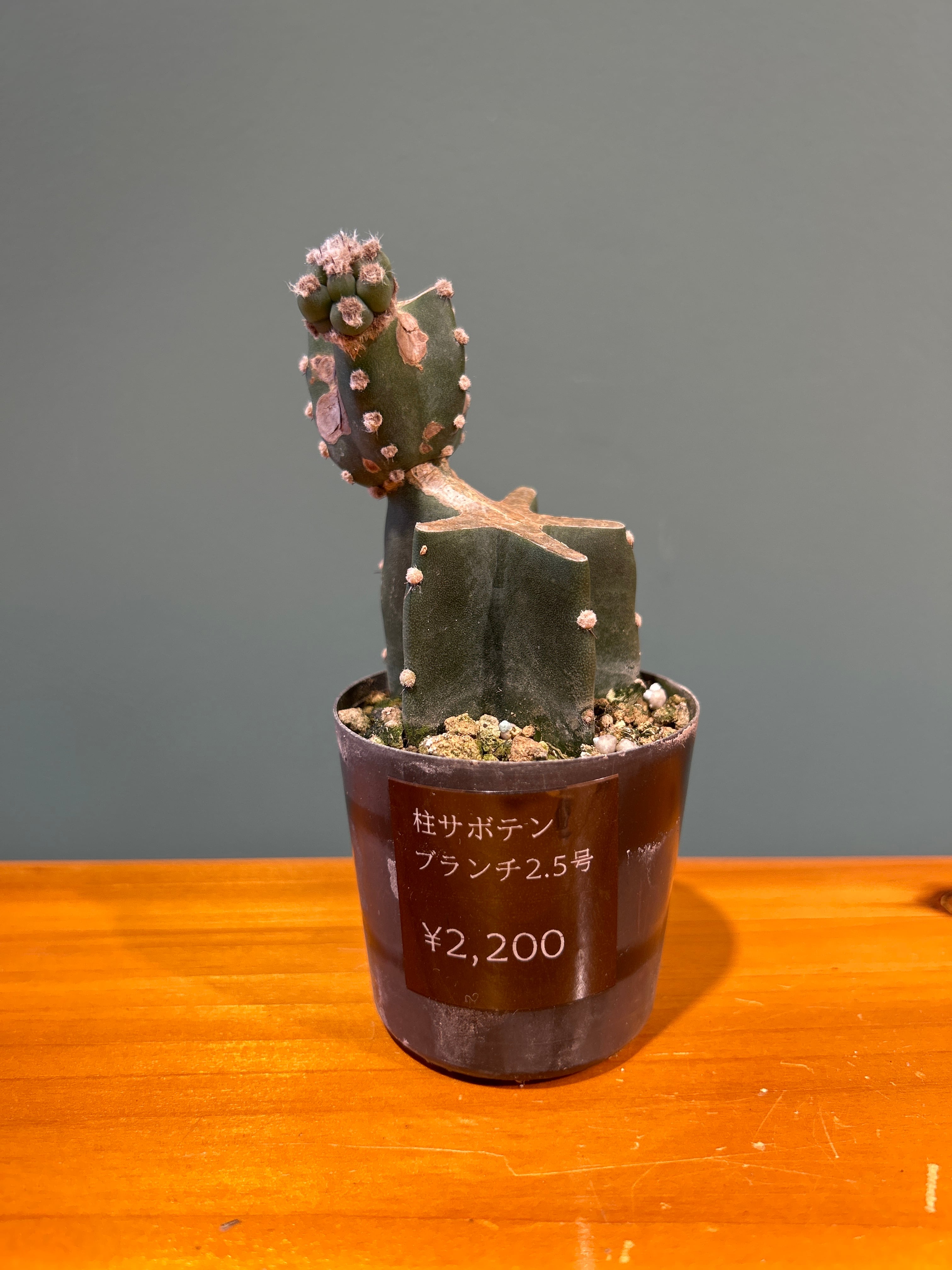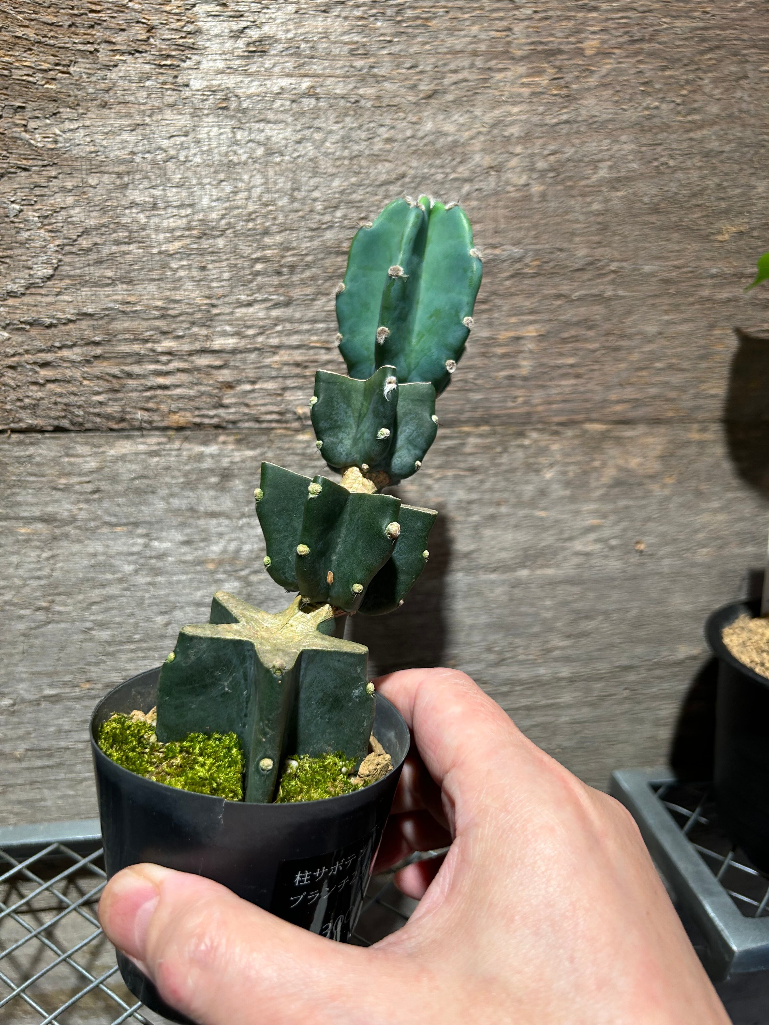 可愛らしいフォルムとトゲが少なくて育てやすいことからも人気のサボテン鬼面角をジグザグのブランチ仕立てに。