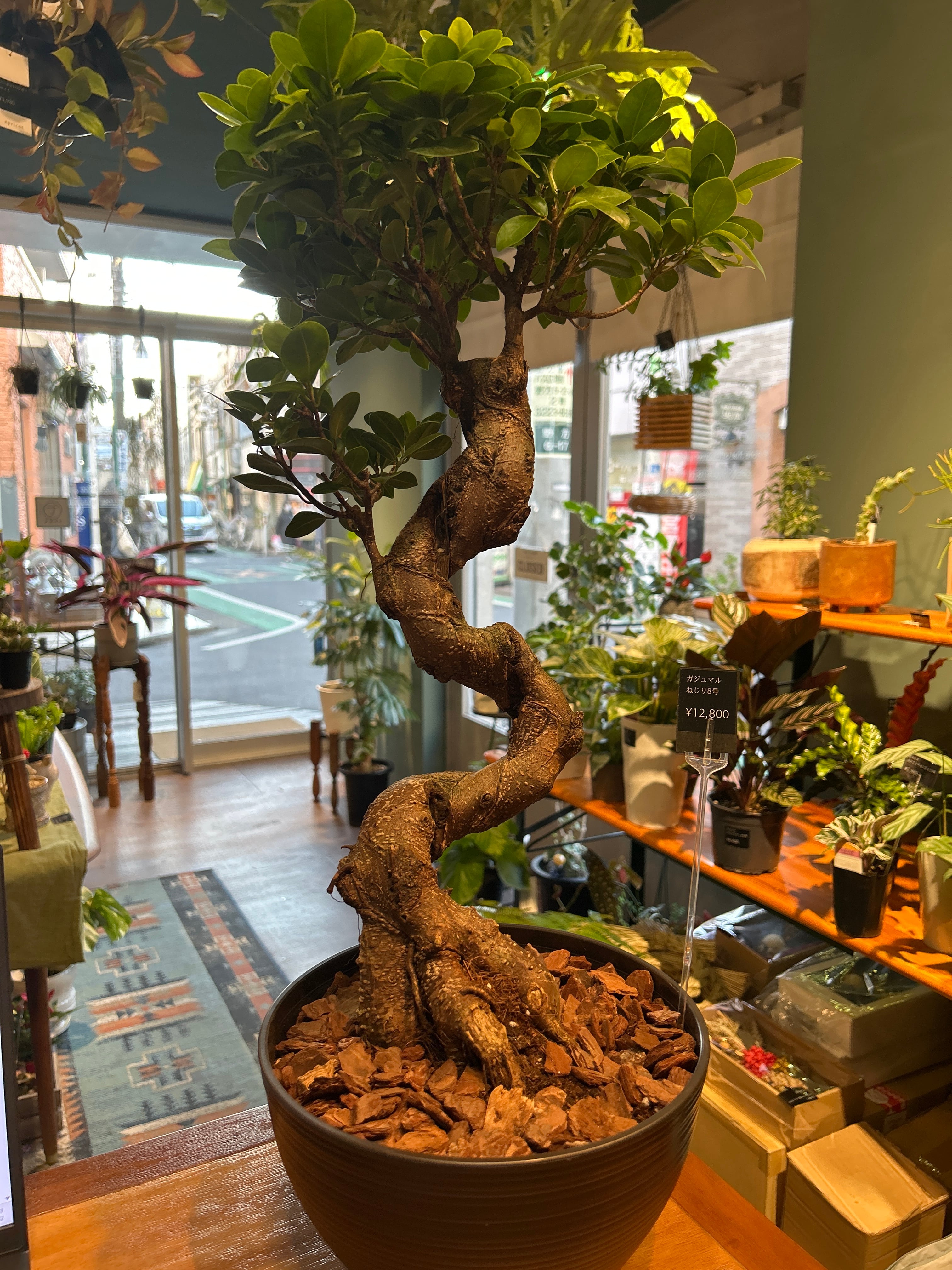 8号鉢で迫力満点、ねじり仕立ては盆栽のような魅力ある株です。