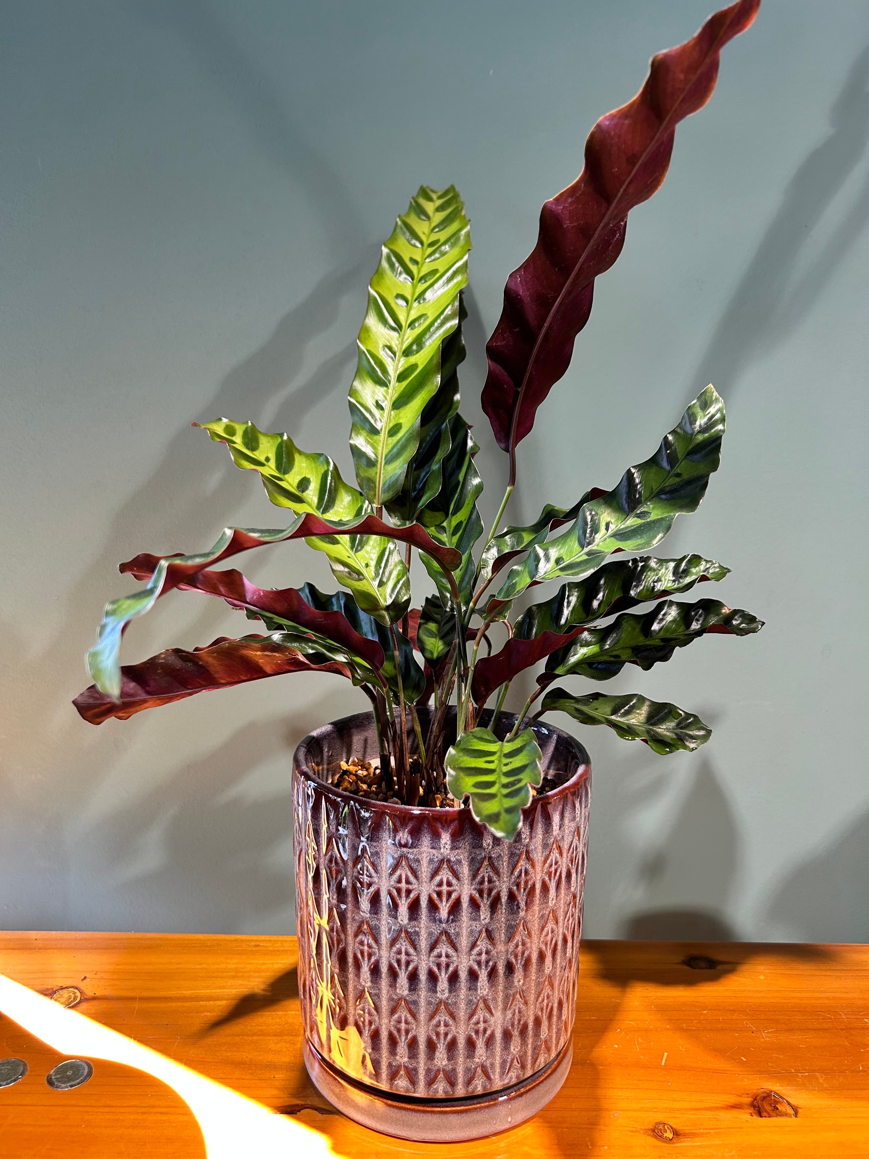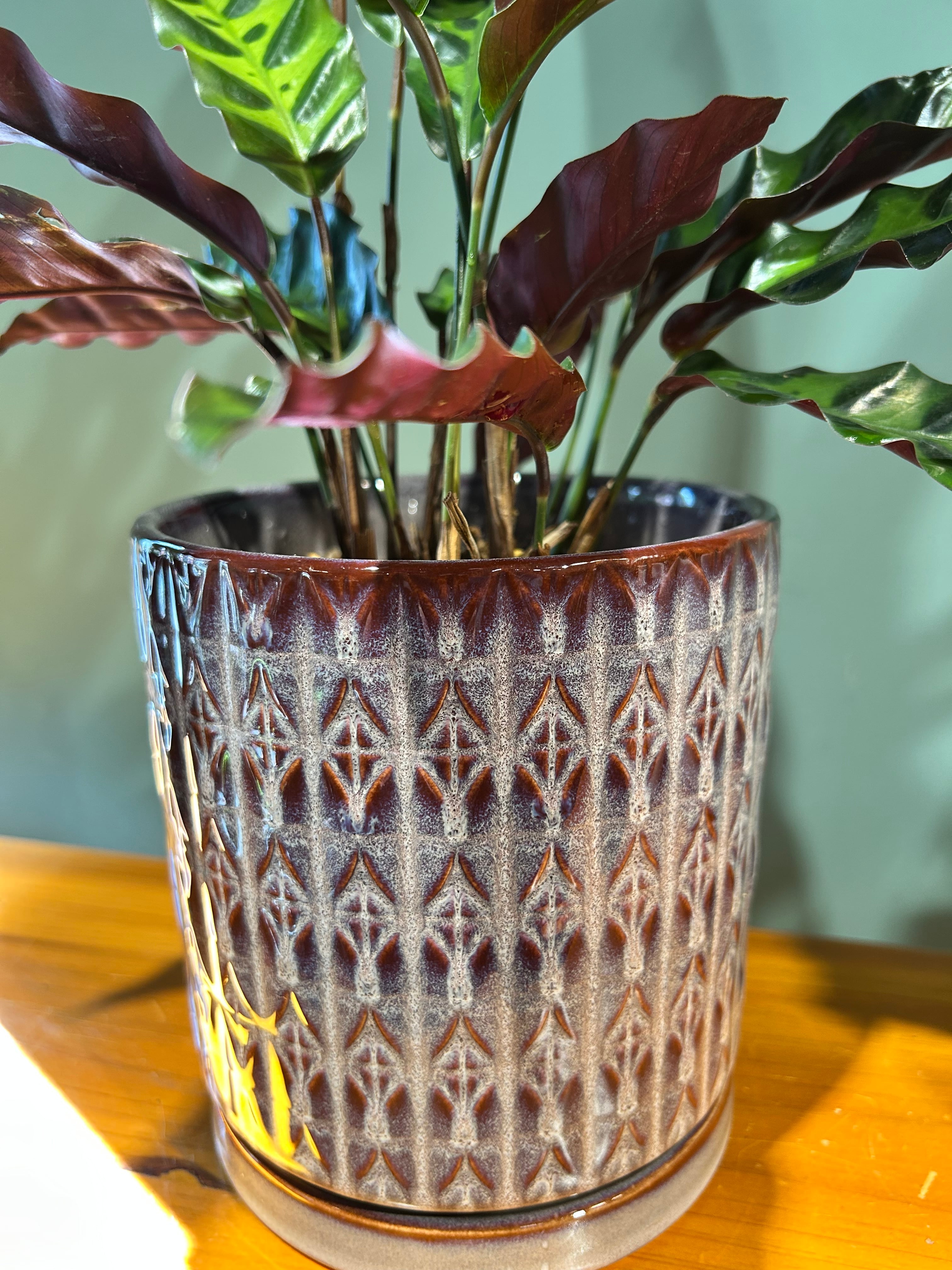 細くスタイリッシュで波うつ葉模様と葉裏の紫が魅力のインシグニス(ランキフォリア)とネイティブ柄のポットをコーディネート。